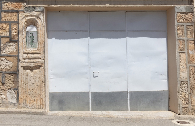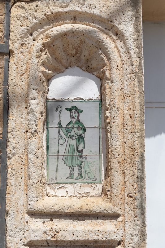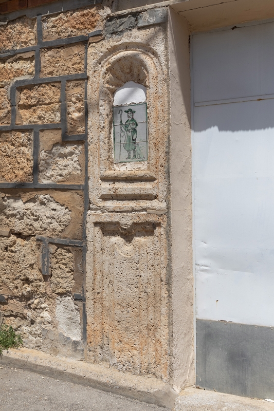 Una gruesa moldura horizontal en listel separa el fuste de la hornacina, que ocupa casi toda la mitad superior del peirón. Es un hueco en arco de medio punto avenerado enmarcado por un grueso baquetón, en cuyo interior hay una placa de cerámica en la que aparece San Roque portando un cayado y acompañado por su característico perro.